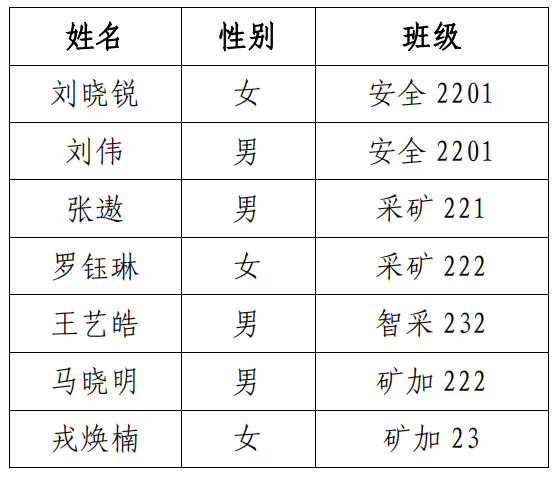 本次选拔设置材料审核与面试两个环节,共计选拔出资源与安全工程学院高年级优秀学生7人担任本科2025级小班主任,录用人员名单如下(排名不分先后):