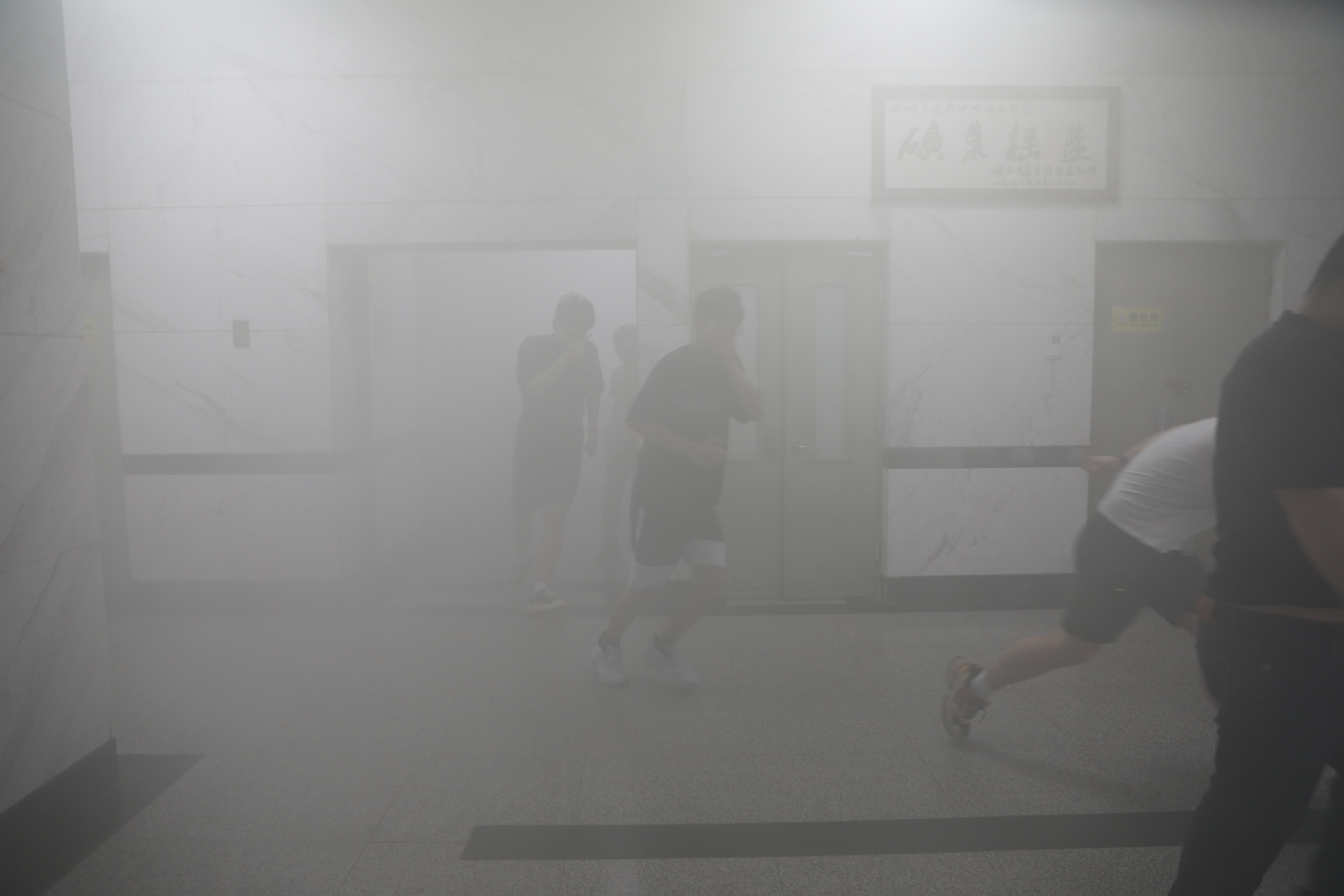 上午9时整,设于2层的模拟着火点点火,楼内释放模拟烟雾,全楼安全警报启动。各楼层疏散引导员迅速响应,严格按照应急预案进入应急处置状态,引导楼内师生经消防通道由高层向低层有序撤离。